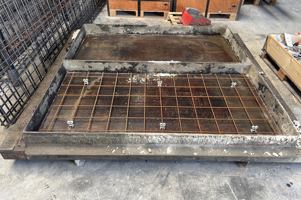 Betonplaten van 100x200cm, 14cm dik. Voordelig gemaakt van het beton dat we aan het eind van de dag overhouden. De bovenzijde is ruwgestort beton, de onderzijde is de gladdere malzijde. De betonplaat is voorzien van een enkel net r8-150 wapening.