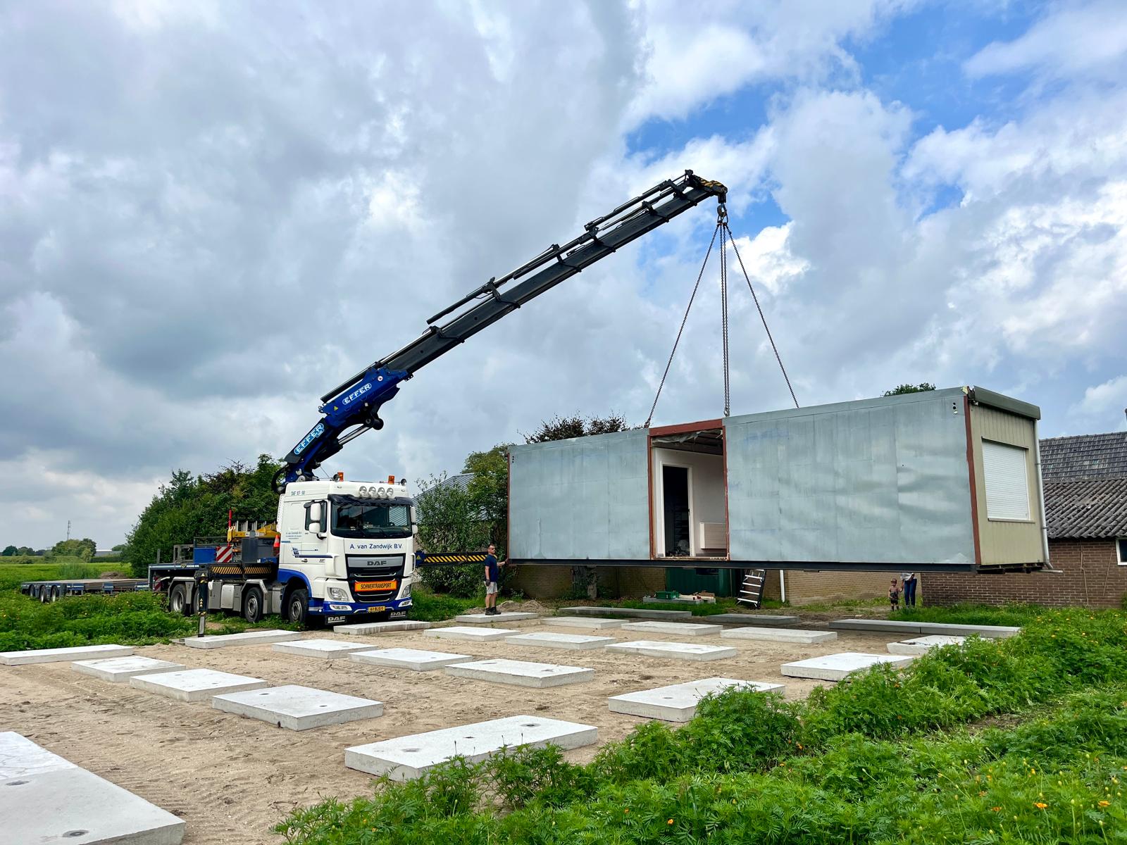 Op de betonnen funderingsplaten zijn woonunits geplaatst.