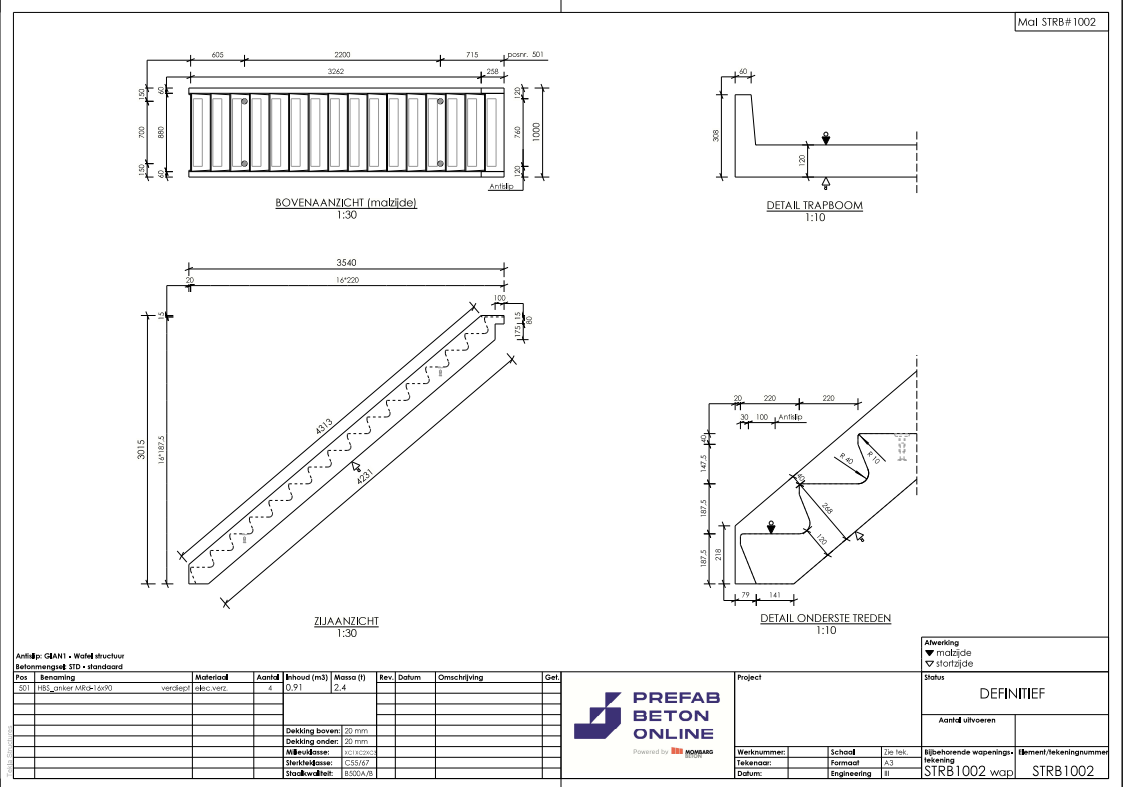 Als de bestelling van de klant binnenkomt, maken onze professionele engineers nauwkeurige tekeningen van de trap. De trap moet uiteraard precies passen tussen de beschikbare ruimte van een pand of gebouw. Zij tekenen o.a. de afmetingen van de treden, de hoek of helling van de trap, de breedte en de hoogte tussen de verdiepingen.