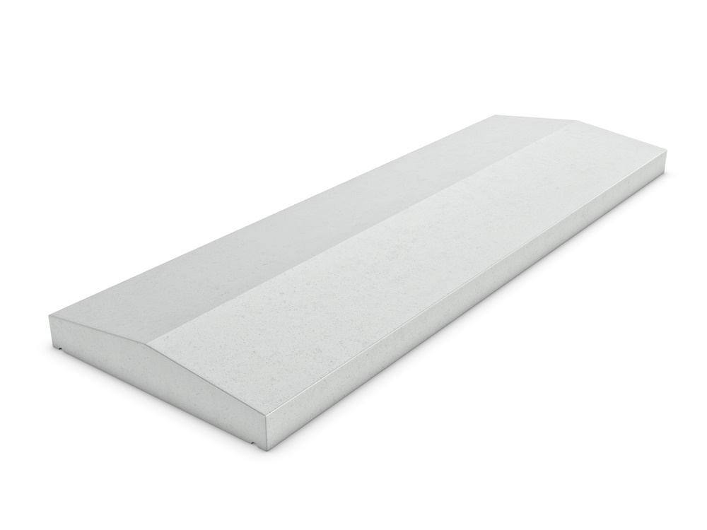 Tweezijdige betonnen muurafdekker of afdekband. In lengte variabel. Waterhol aan beide kanten. Bij afname van muurafdekkers brengen we transportkosten in rekening. Voor de eerste afdekker is deze relatief hoog, voor alle andere afdekkers komt er slecht vijf euro per product aan transportkosten bij. Je kunt je bestelling ook gratis afhalen in Lunteren (Gelderland).